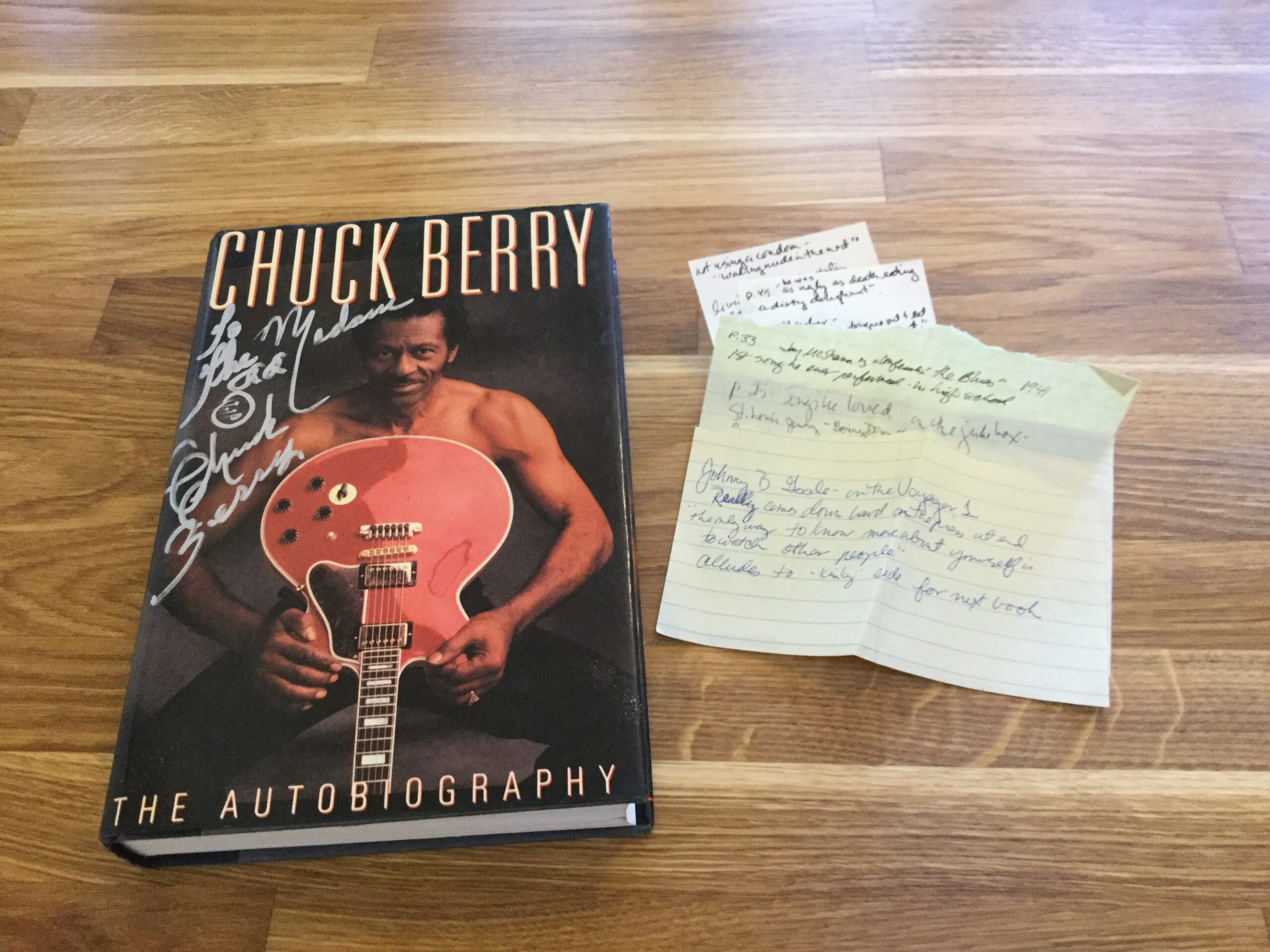 I confess, I probably wouldn’t have read Chuck Berry’s autobiography had I not seen Bob Dylan reading it backstage. I immediately bought it and devoured it. Not long after, Berry played a club in New York City and I was asked to introduce him onstage as part of my DJ duties as “The Rock and Roll Madame” on K-ROCK (WXRK). Hearing of his passing at age 90 brought back memories of one of the best concerts I’ve ever seen. When I took out my signed copy of Chuck Berry: The Autobiography I was not expecting to find my notes tucked in the flap.