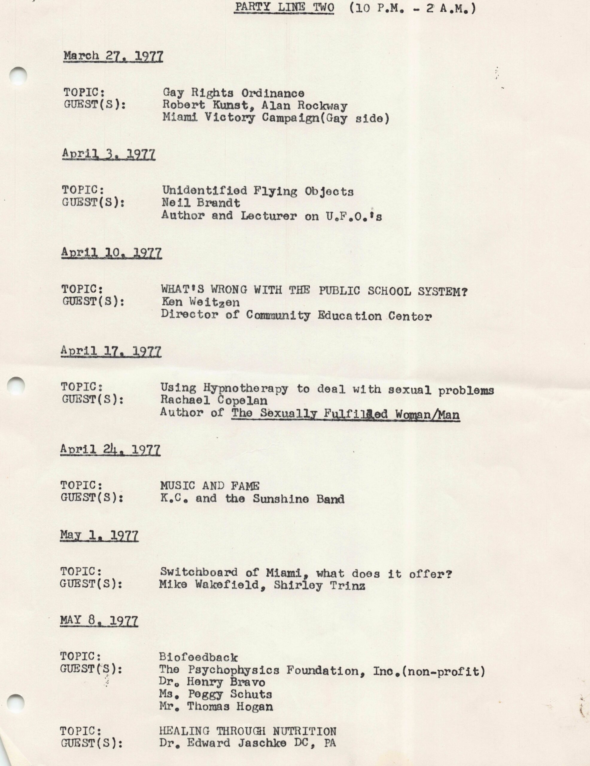 Sample of 96X Party Line public affairs show topics. It aired live with callers Sunday nights from 10pm to 2am.