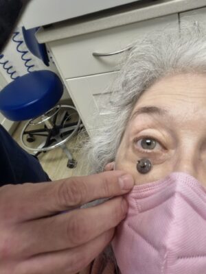 It took about 2.5 hours to create the mold for the acrylic prosthetic, then tweak it, choose the best iris from over 700, and a pupil size. I left while the iris was painted and white area around the eye was modified to look like mine. I returned a week later for another 2.5 hours.