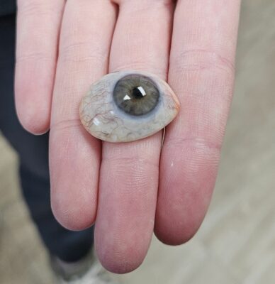 It’s not a glass eye. It’s acrylic. The base is a white acrylic, the paint is a UV-cured acrylic, then clear acrylic goes on top. If I drop it, it won’t shatter, but it could crackle like old china.